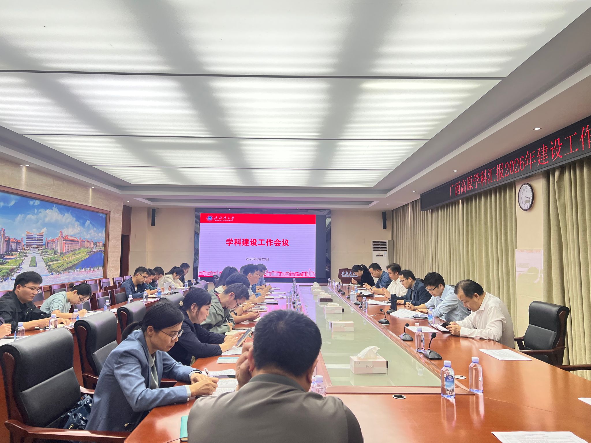 3月23日下午,学校在办公楼523会议室召开学科建设工作会议。学校副校长尹艳镇出席会议,各二级学院负责人、广西高原学科负责人及校级学科负责人参加会议。发展规划处处长梁家海主持会议。