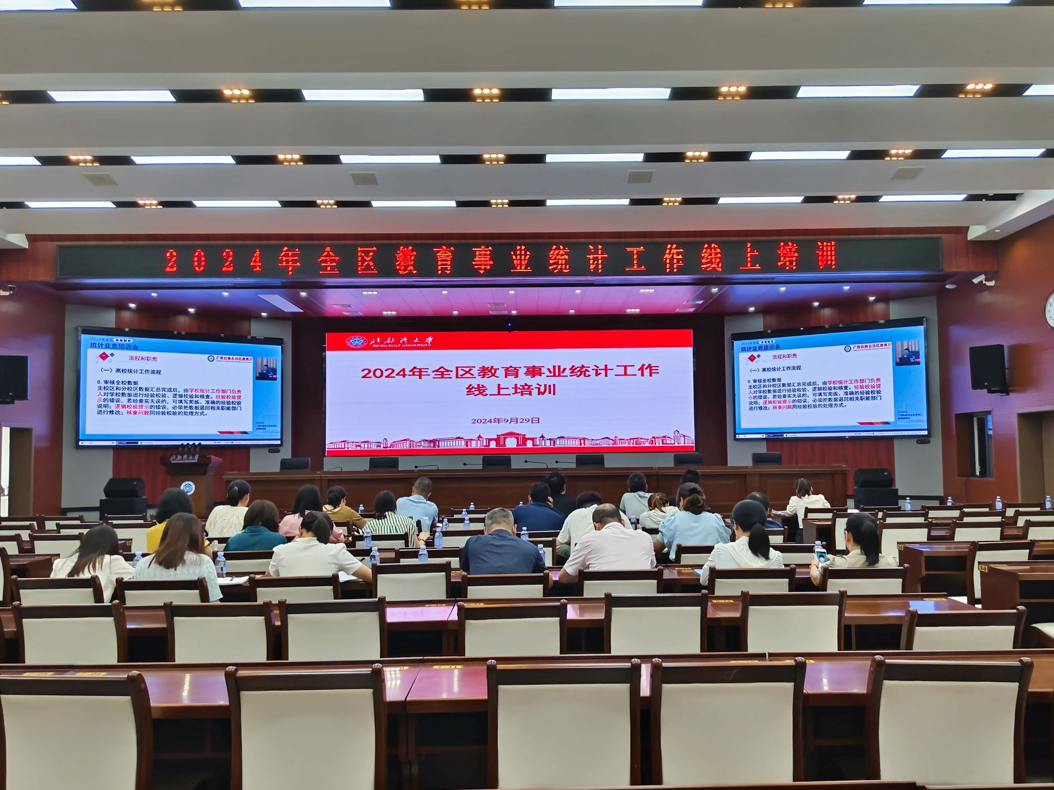 9月29—30日,自治区教育厅召开了2024 年全区教育事业统计工作线上培训及2024年全区教育事业统计工作视频会。学校在办公楼一楼报告厅设立了分会场,党委副书记唐高华、副校长梁智分别在桂林航天工业学院分会场和校内会场参会。同时,党校办、组织部、保卫处、学生工作处、人事处、教务处、科技处、发展规划处、研究生院、国际交流处、财务处、国有资产与实验室管理处、基建处、后勤保障处、团委、体育学院、继续教育学院、图书馆、学报编辑部、网络与教育技术中心等单位的主要负责人及统计工作人员参加了会议。
