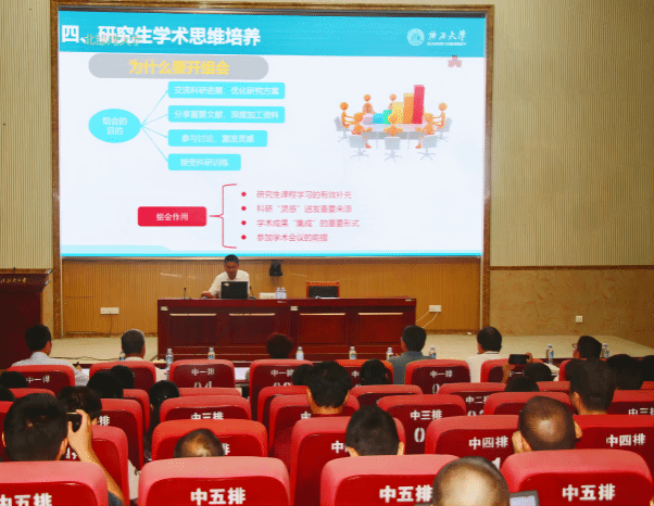 刘琼处长向参训导师传达了首届中国学位与研究生教育大会的精神,并介绍了学校近年来在研究生教育工作中取得的成果,同时指出了尚需努力的方向,要求全体导师坚守使命与职责,尽心指导研究生的科研和学业,以德育人,以文化人,积累优秀的教学成果,助力研究生成长成才。