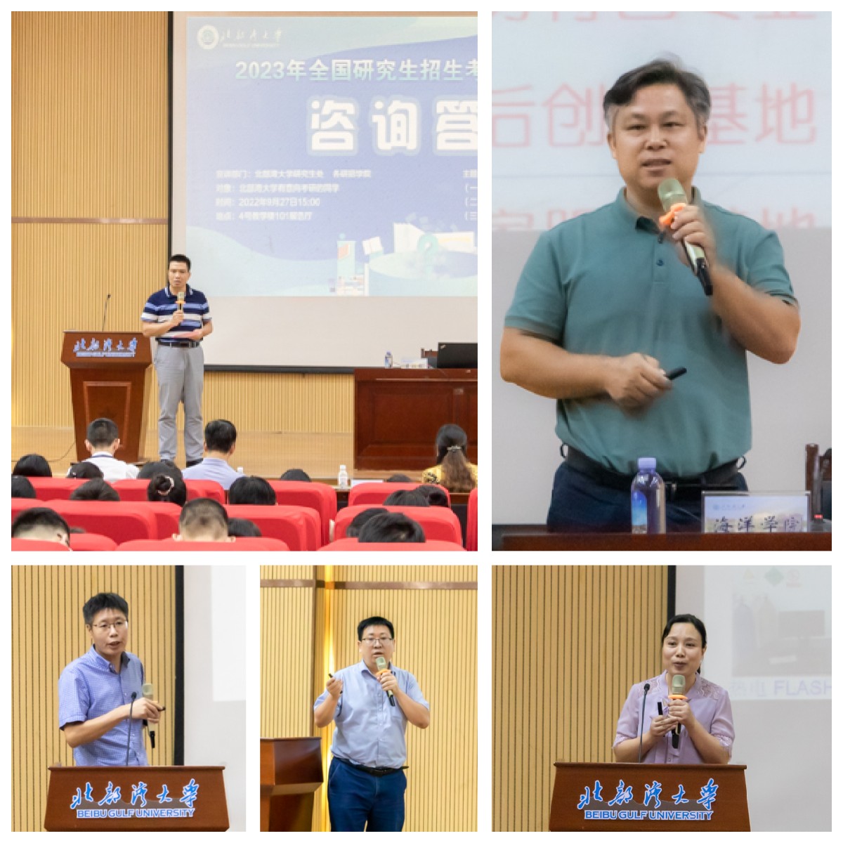 研究生处联合研究生工作部以及海洋、机船、经管等10个学院研究生工作负责人组成了湾大研究生招生考试宣讲团,为同学们答疑解惑。研究生处处长刘琼立足全国研究生教育现状和发展趋势,剖析了本科生考研、读研的重要性,向同学们传授了一志愿目标高校和专业的选择、报考的方法和技巧,分享了北部湾大学培养的研究生取得的良好效果,刘琼强调,北部湾大学研究生教育发展较快,注重人才培养质量,欢迎同学们报考。研究生工作部部长裴以明向同学们介绍了北部湾大学研究生奖助体系以及研究生毕业后的良好就业机会,鼓励同学们紧抓机遇,继续深造,努力成为可堪大用、能担重任的栋梁之才。随后,海洋、机船、经管等10个学院研究生工作负责人从学科专业的优势与特色、研究生培养以及就业等多个方面分别介绍了本学院研究生教育开展情况。