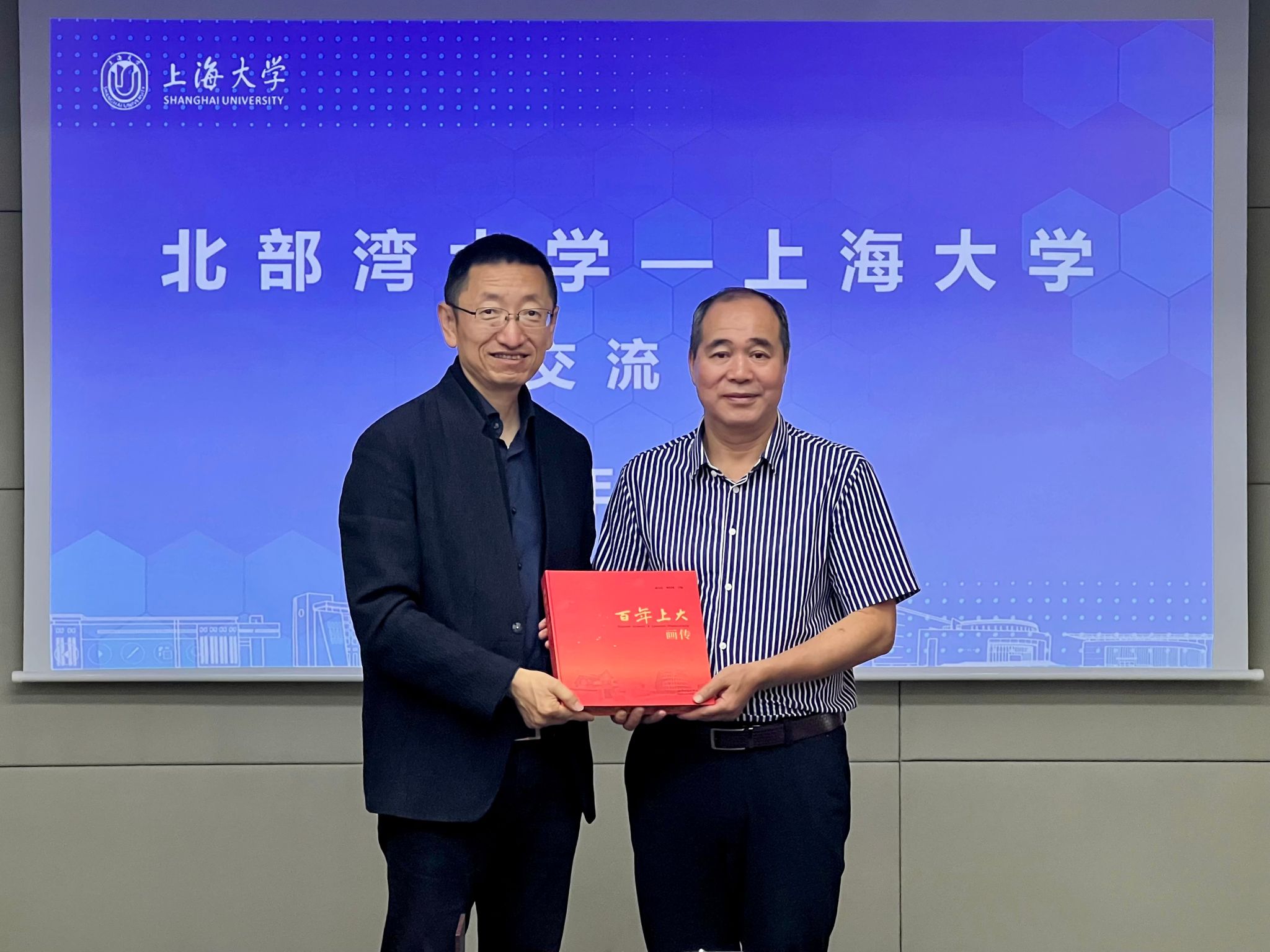 上海大学苟燕楠(左)向我校赠送百年上大画册,唐高华(右)代表学校接受赠予