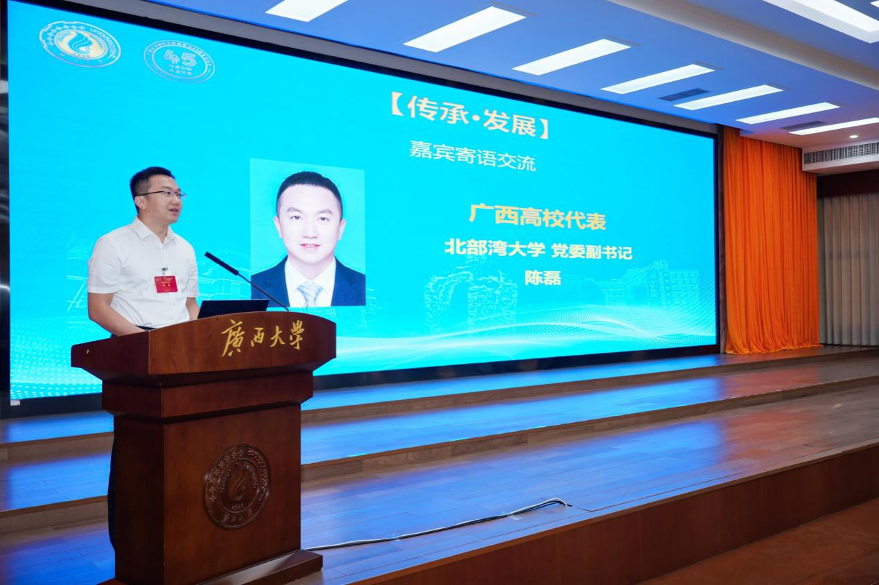 会上自治区教育厅党组副书记、副厅长闫炳辰,广西大学党委副书记、自治区纪委监委驻广西大学纪检监察组组长、纪委书记金顺南分别致辞。陈磊受邀作为区内高校代表发言,向广西大学96年的光辉历史和45年研究生教育所取得的成就致以祝贺。他表示,得益于自治区教育厅的大力支持、广西大学的倾情对口帮扶和兄弟院校的积极帮助,北部湾大学在较短时间内实现了办学层次和办学水平的跨越式发展,正朝着建成海洋特色鲜明的高水平应用型大学目标开拓奋进。新征程上,期待与全区高校一道,携手为广西高等教育发展、谱写中国式现代化广西篇章培育更多优秀人才,为加快建设教育强国贡献更大力量。